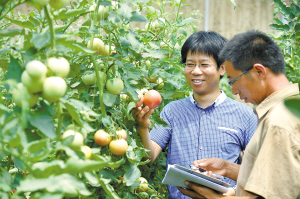 看著長勢良好的西紅柿,李鋒(左)的臉上掛滿笑容。